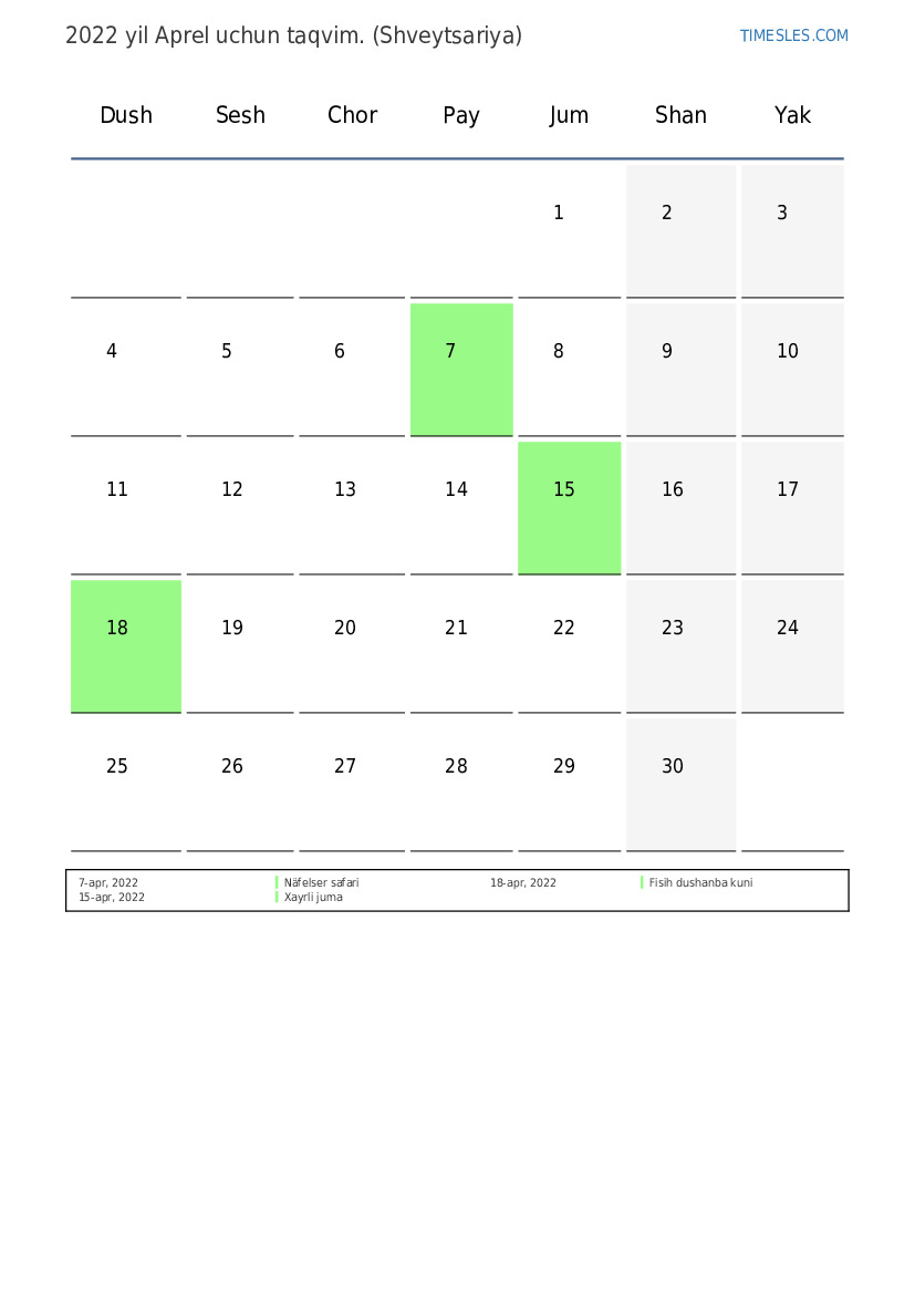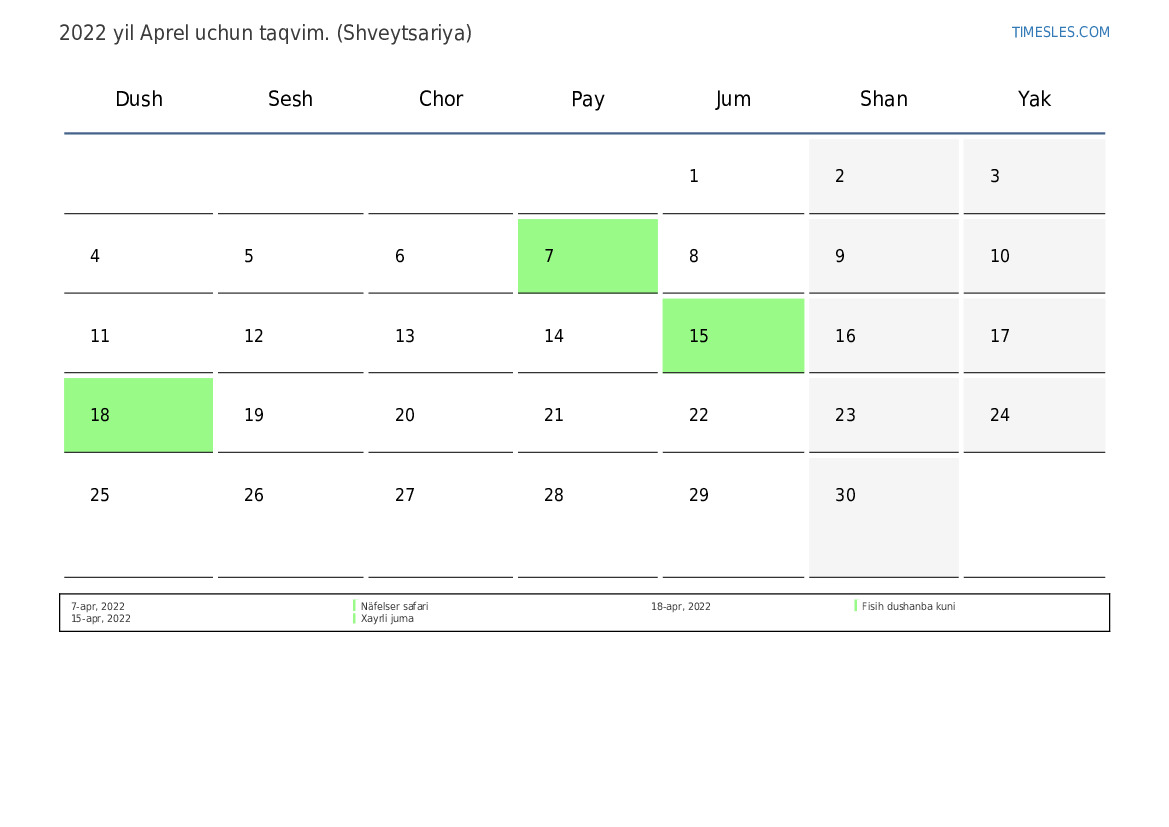 Shveytsariya uchun 2022 yil Aprel uchun ta'til va dam olish kunlari taqvimi