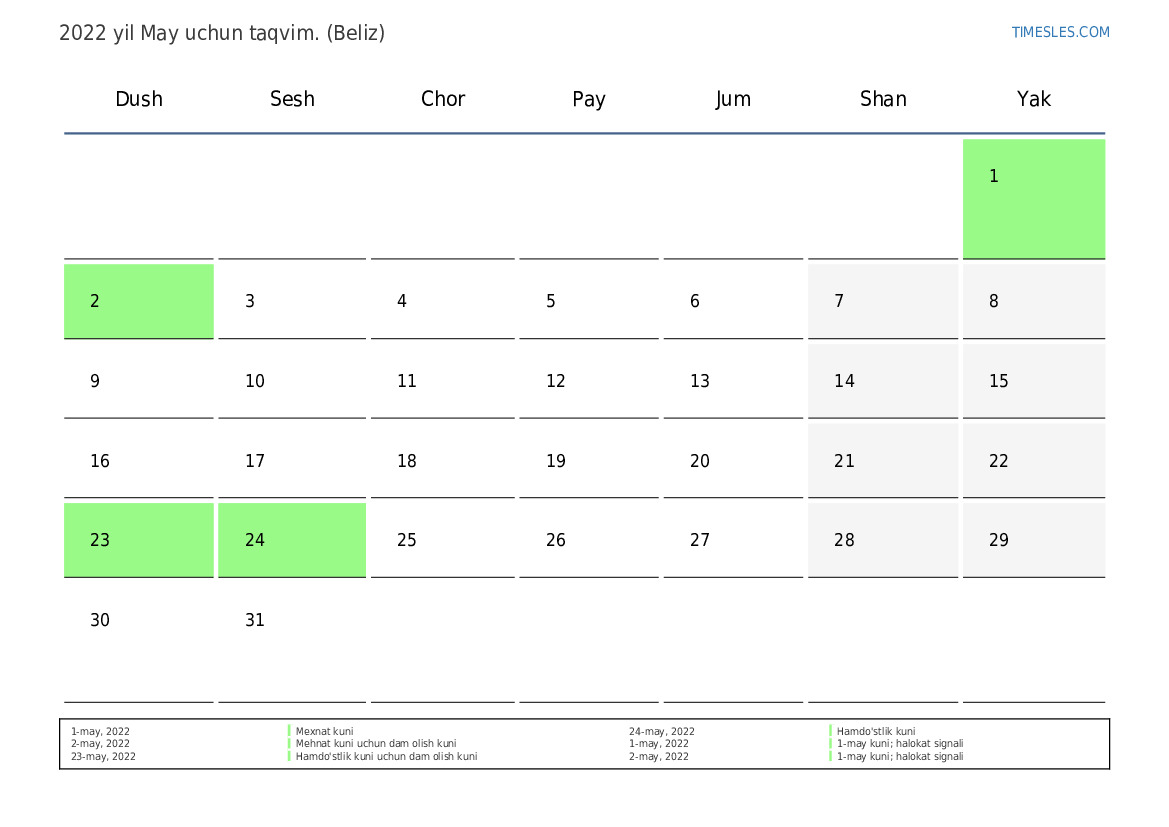 Beliz uchun 2022 yil May uchun ta'til va dam olish kunlari taqvimi