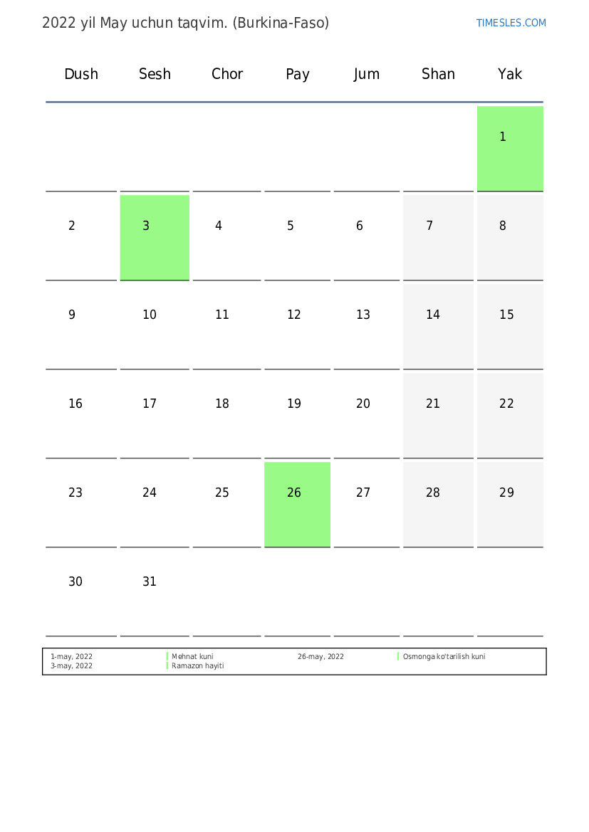 Burkina-Faso uchun 2022 yil May uchun ta'til va dam olish kunlari taqvimi