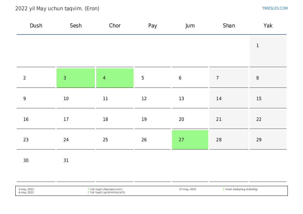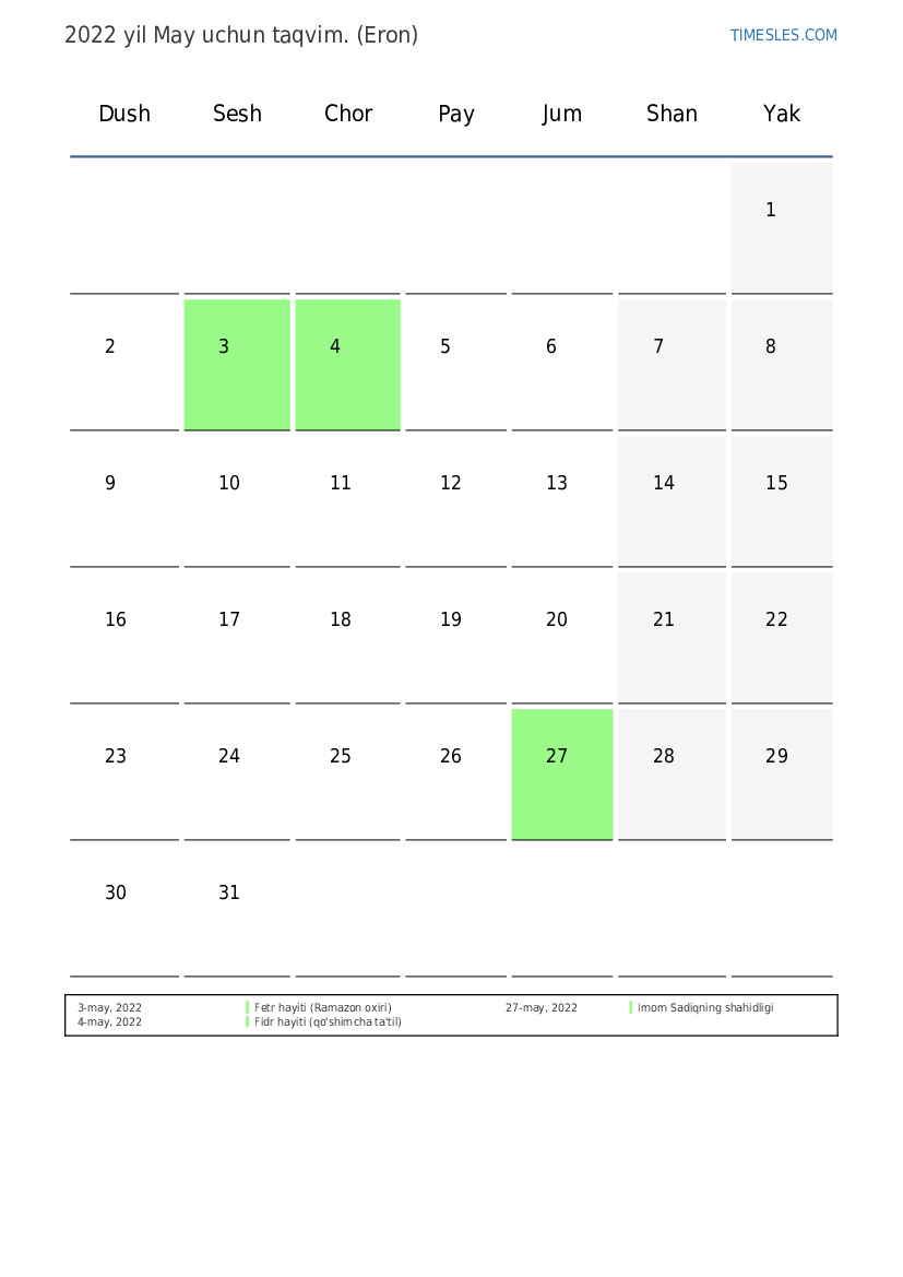 Eron uchun 2022 yil May uchun ta'til va dam olish kunlari taqvimi