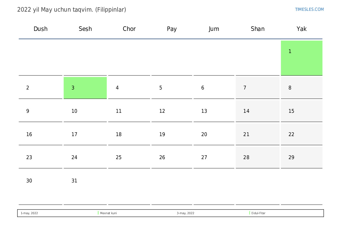 Filippin uchun 2022 yil May uchun ta'til va dam olish kunlari taqvimi