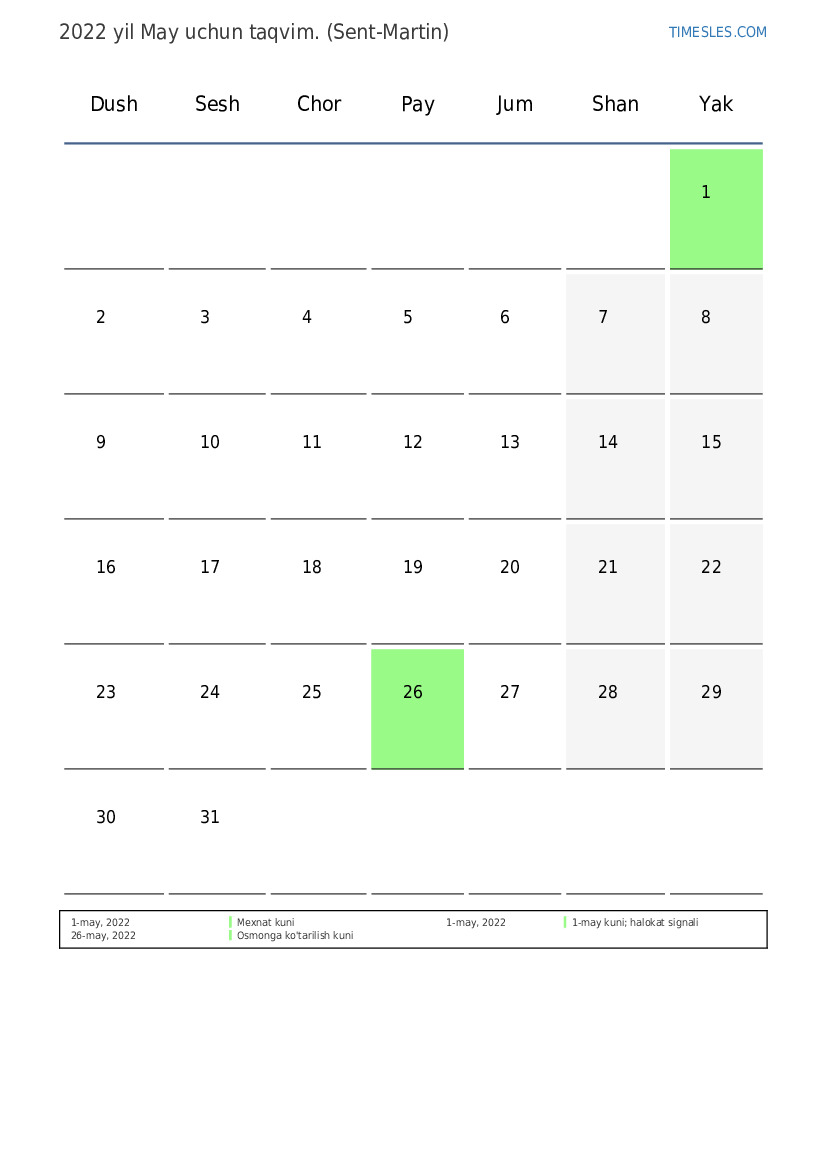 Sint Marten uchun 2022 yil May uchun ta'til va dam olish kunlari taqvimi