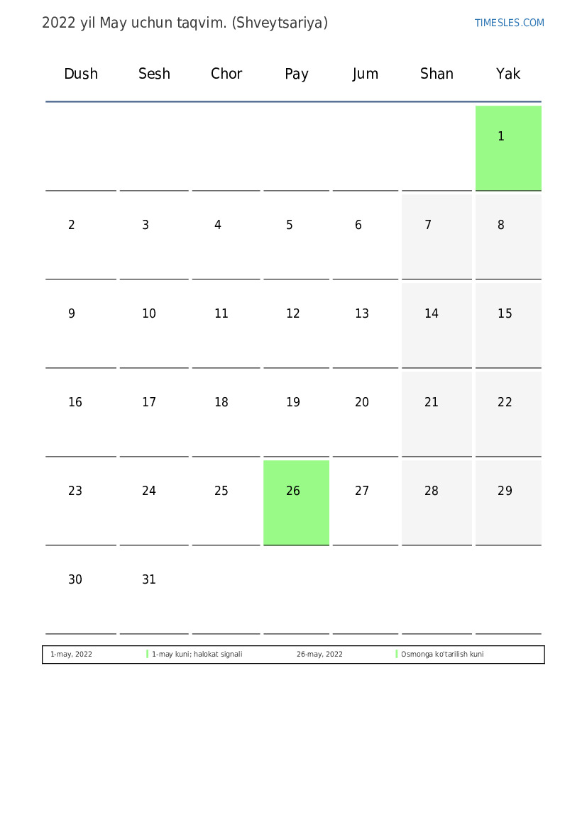 Shveytsariya uchun 2022 yil May uchun ta'til va dam olish kunlari taqvimi