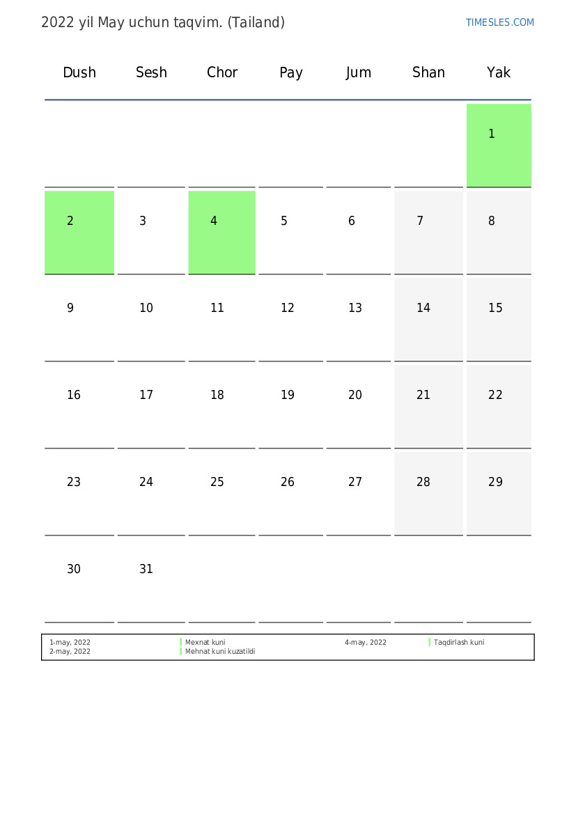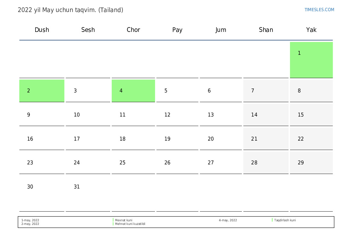 Tailand uchun 2022 yil May uchun ta'til va dam olish kunlari taqvimi