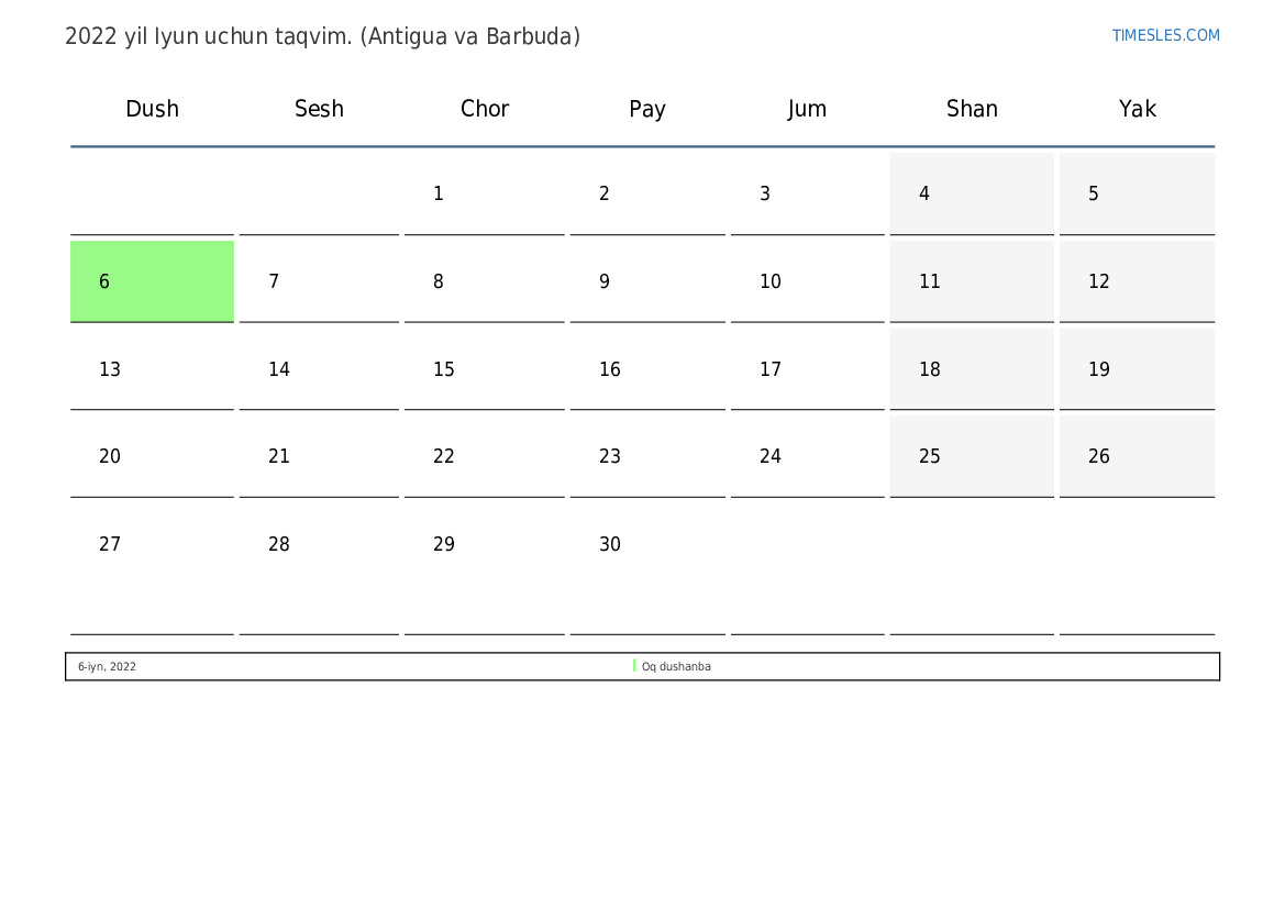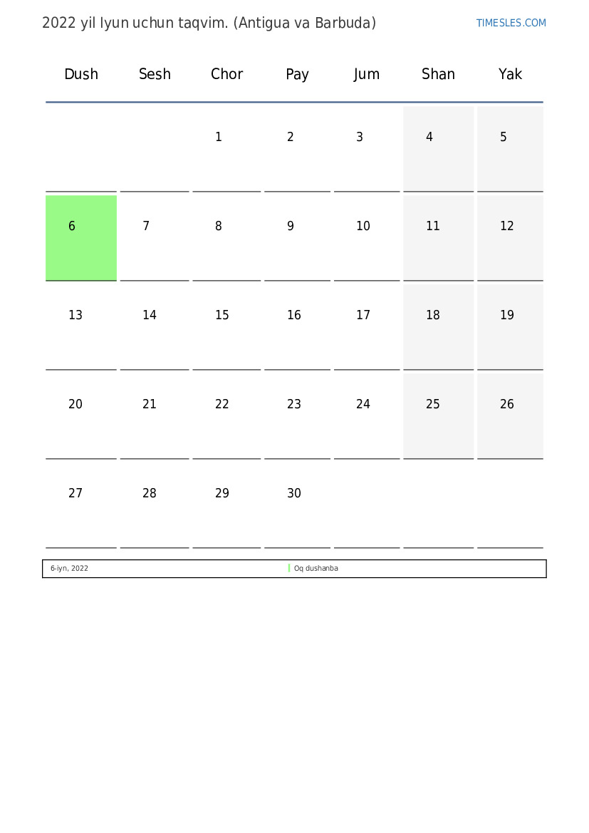 Antigua va Barbuda uchun 2022 yil Iyun kalendar
