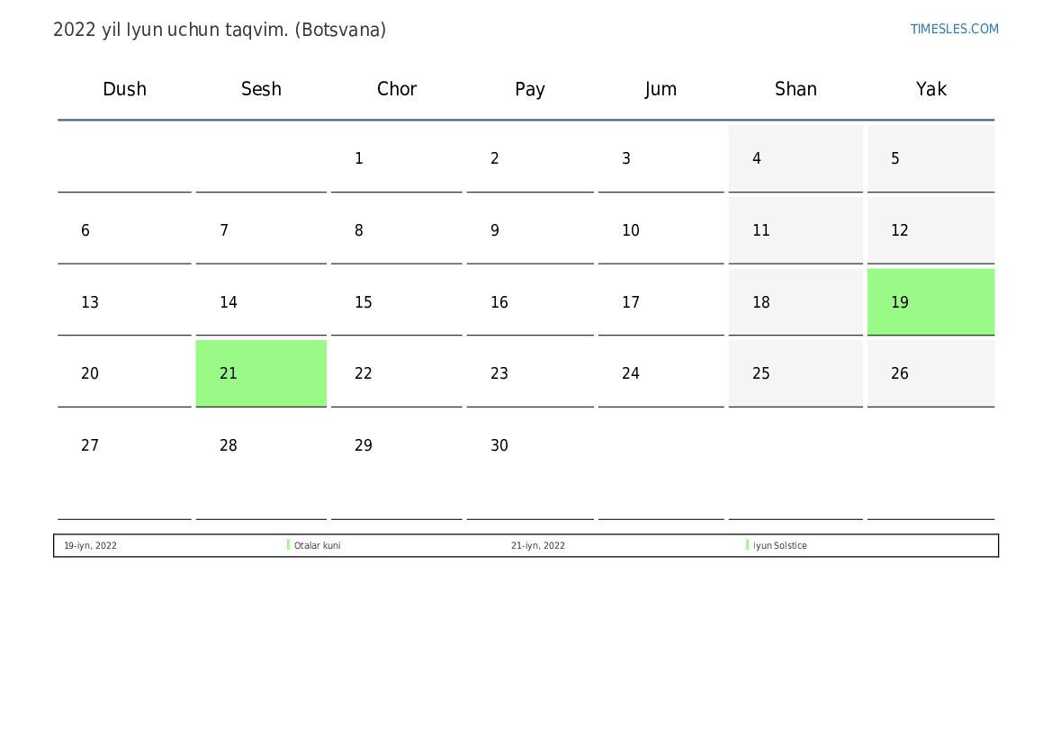 Botsvana uchun 2022 yil Iyun uchun ta'til va dam olish kunlari bilan PDF taqvimini yuklab oling va chop eting