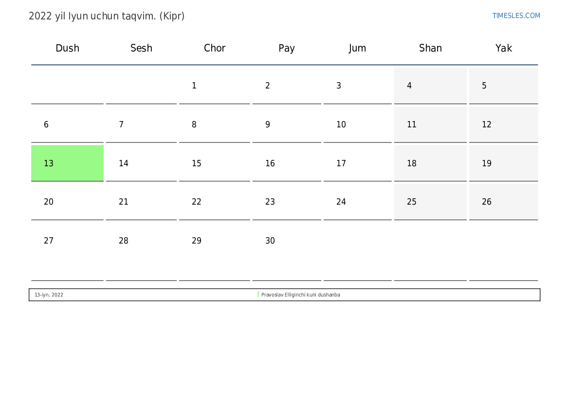 Kipr uchun 2022 yil Iyun uchun ta'til va dam olish kunlari taqvimi