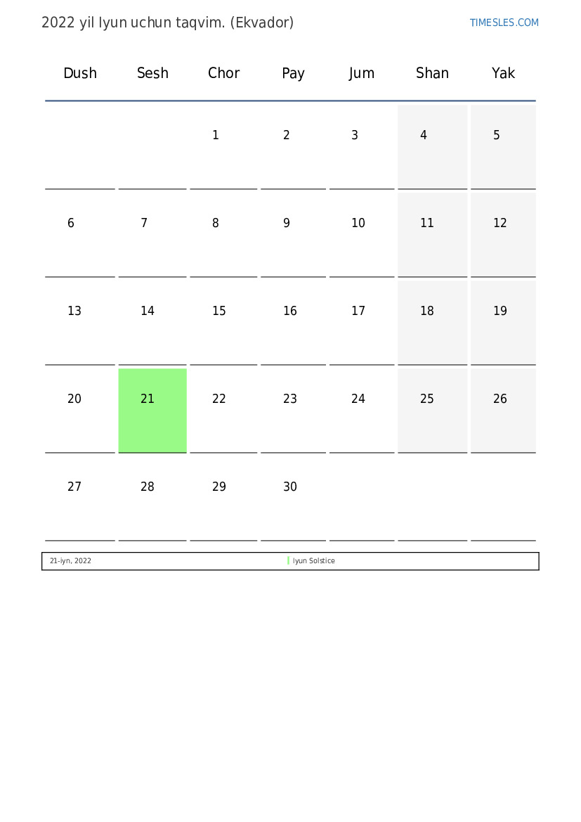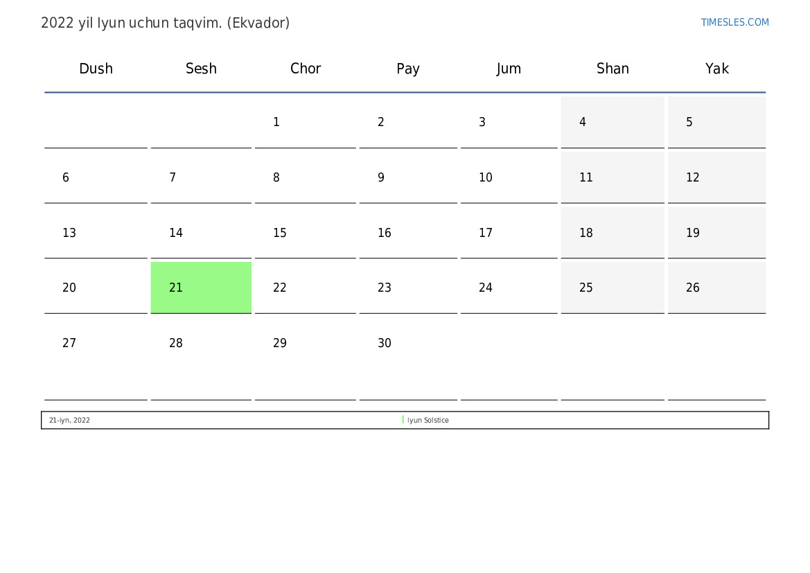 Ekvador uchun 2022 yil Iyun uchun ta'til va dam olish kunlari taqvimi