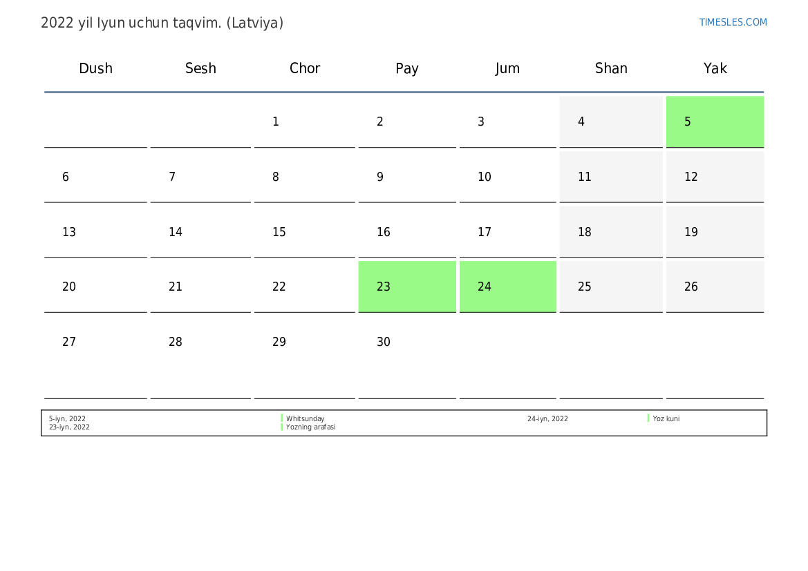 Latviya uchun 2022 yil Iyun uchun ta'til va dam olish kunlari taqvimi