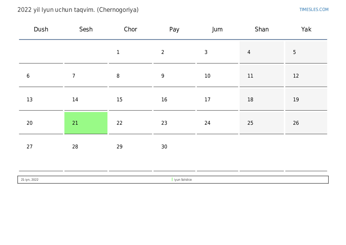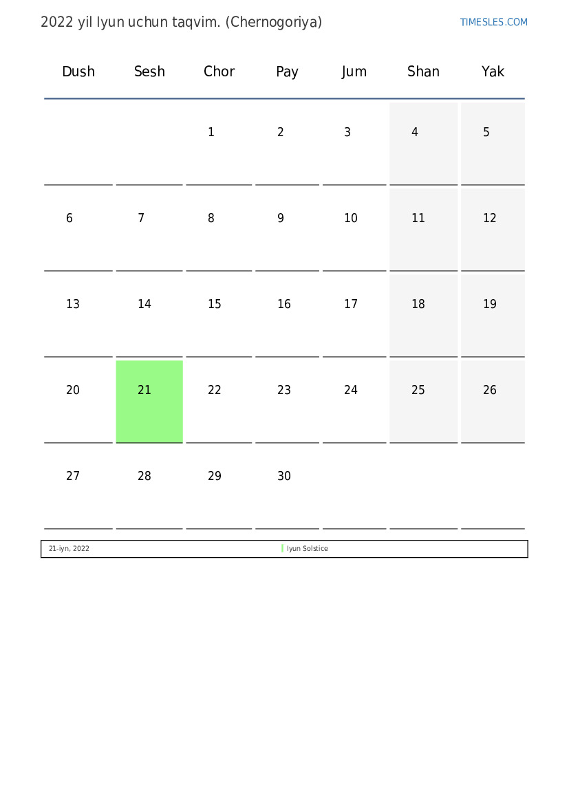 Chernogoriya uchun 2022 yil Iyun kalendar