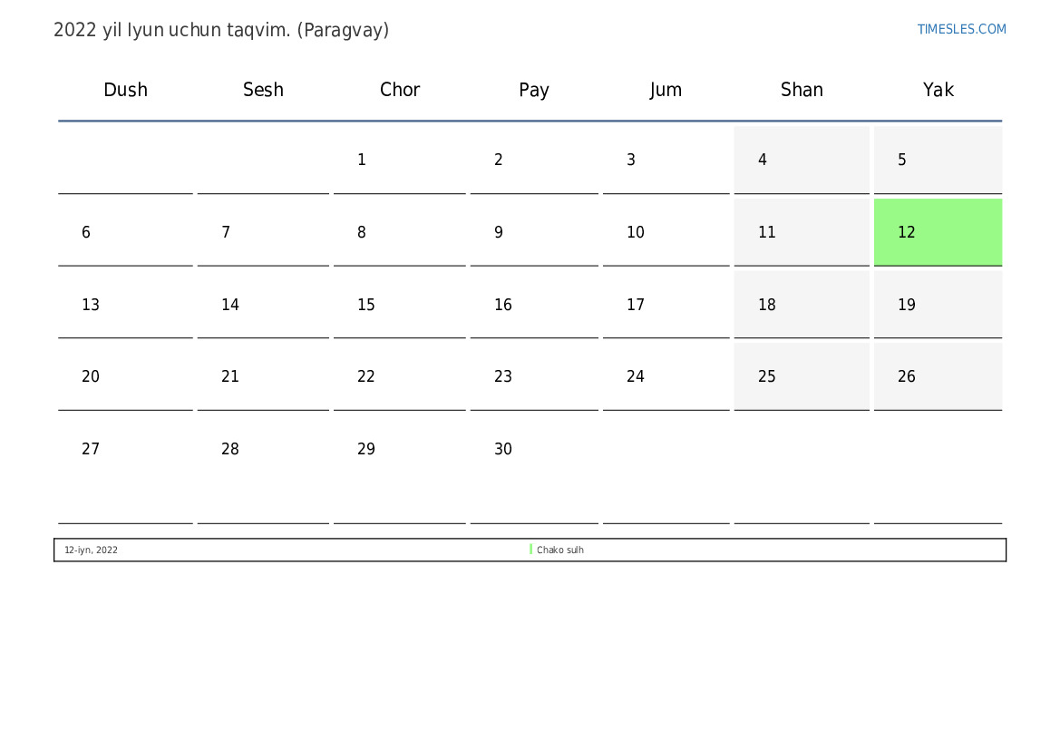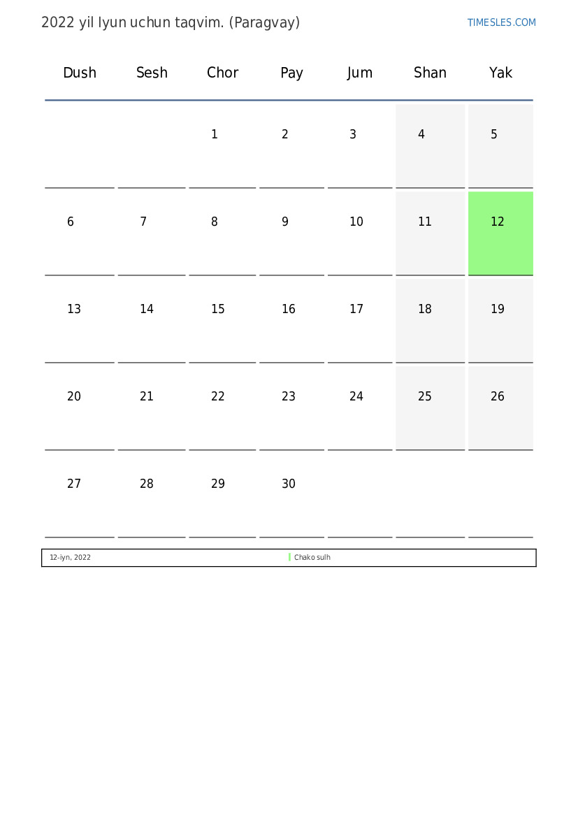 Paragvay uchun 2022 yil Iyun uchun ta'til va dam olish kunlari taqvimi