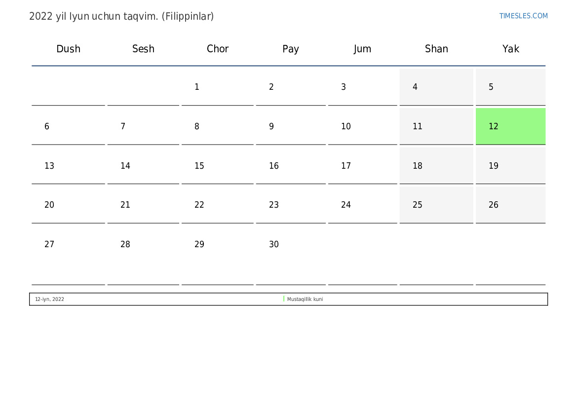 Filippin uchun 2022 yil Iyun uchun ta'til va dam olish kunlari taqvimi
