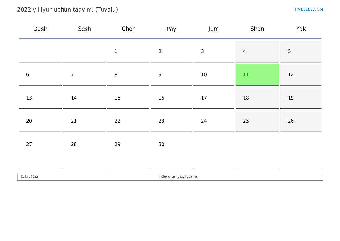 Tuvalu uchun 2022 yil Iyun uchun ta'til va dam olish kunlari taqvimi