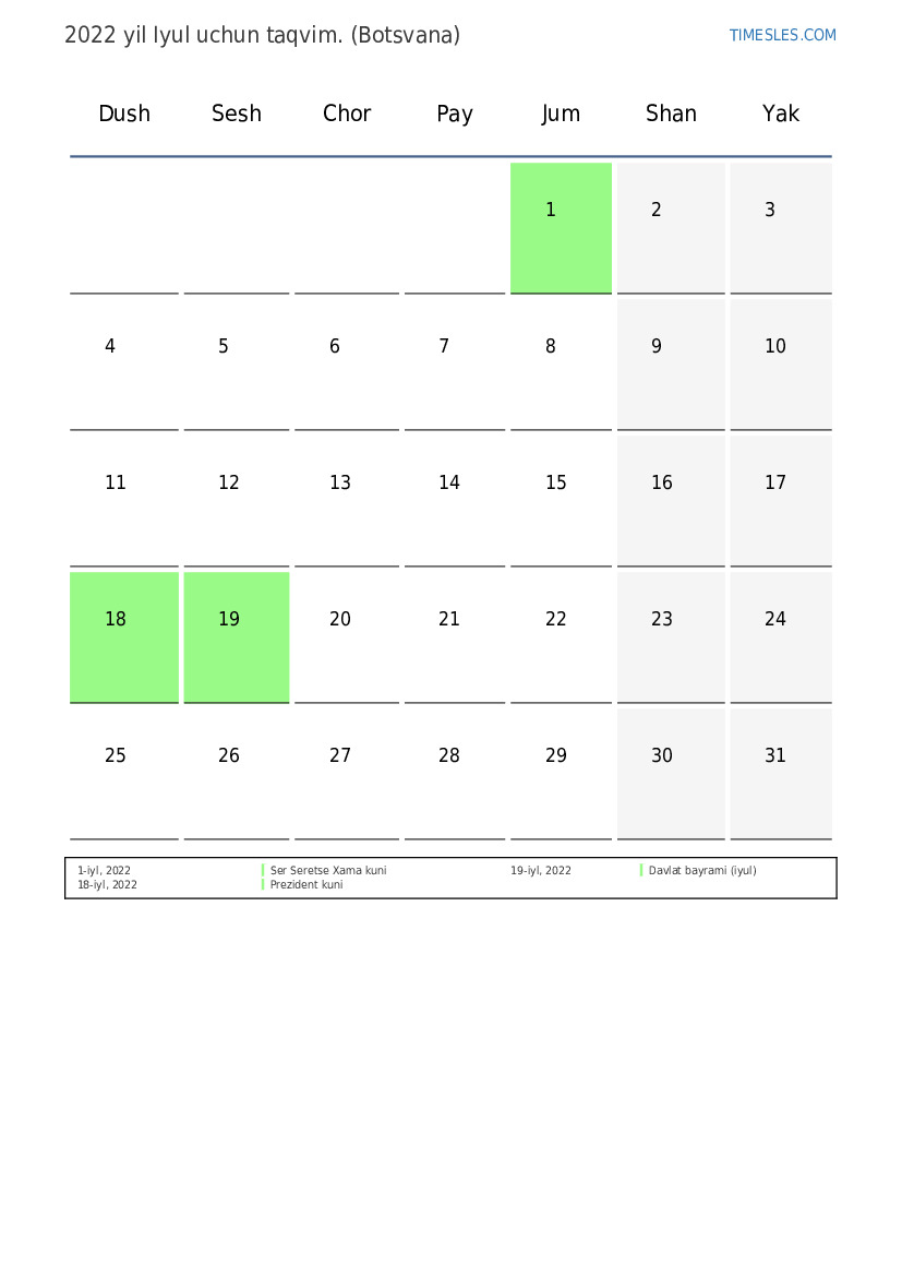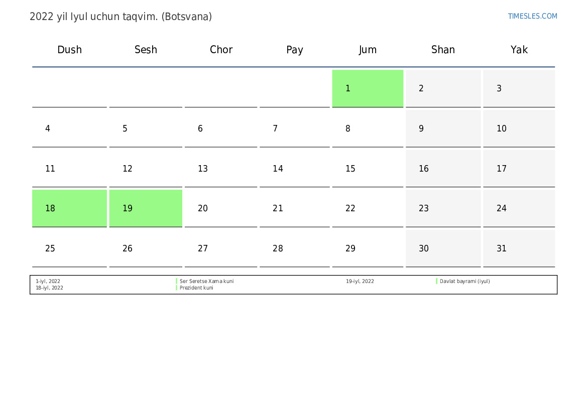 Botsvana uchun 2022 yil Iyul uchun ta'til va dam olish kunlari taqvimi