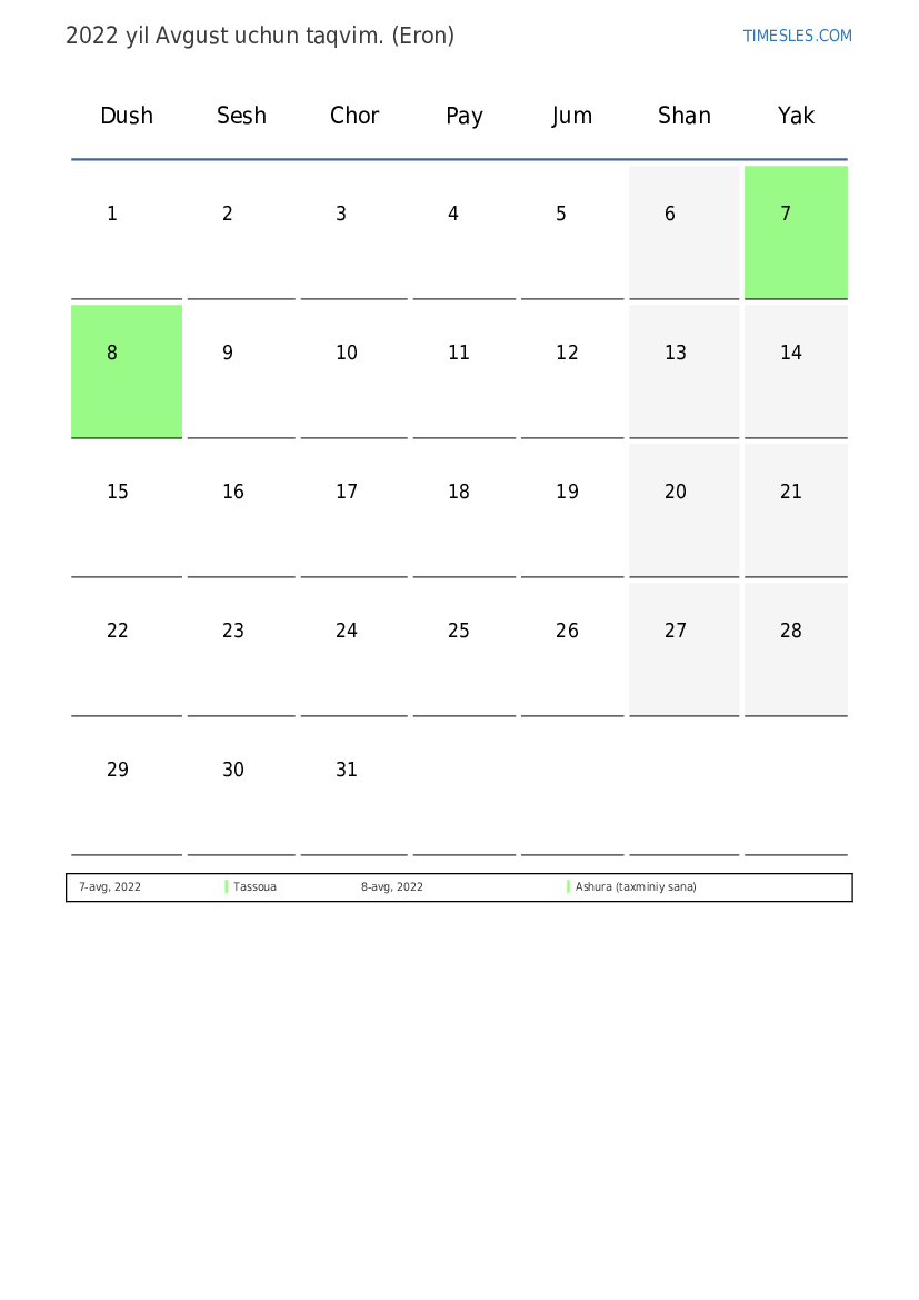 Eron uchun 2022 yil Avgust uchun ta'til va dam olish kunlari taqvimi
