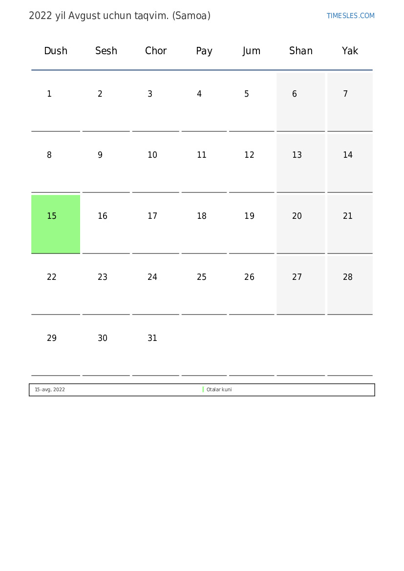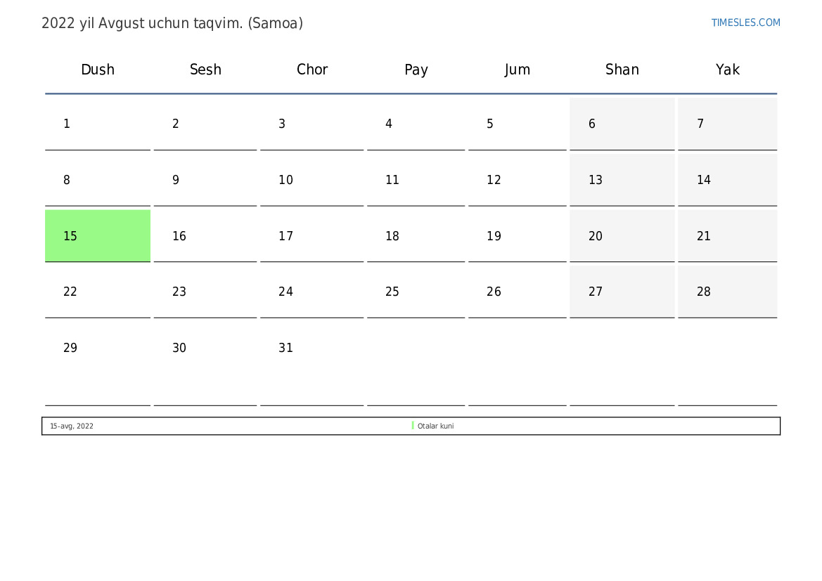Samoa uchun 2022 yil Avgust uchun ta'til va dam olish kunlari taqvimi