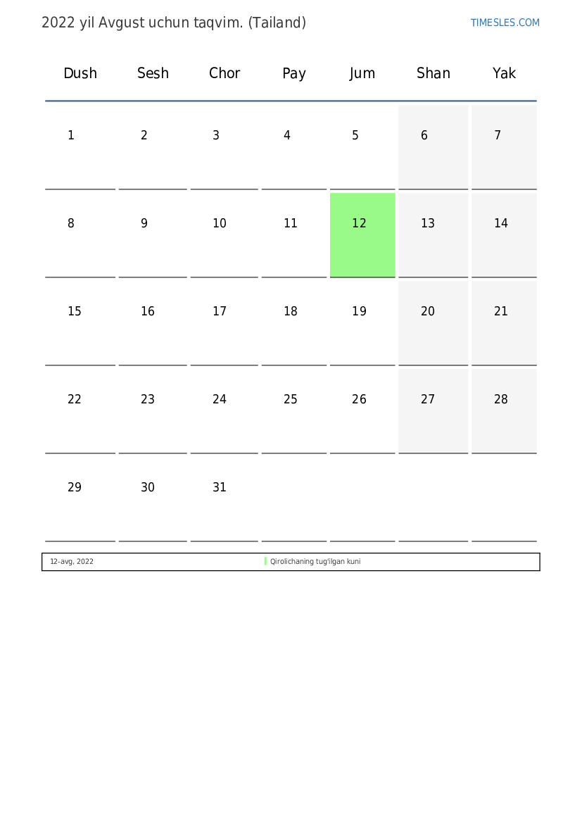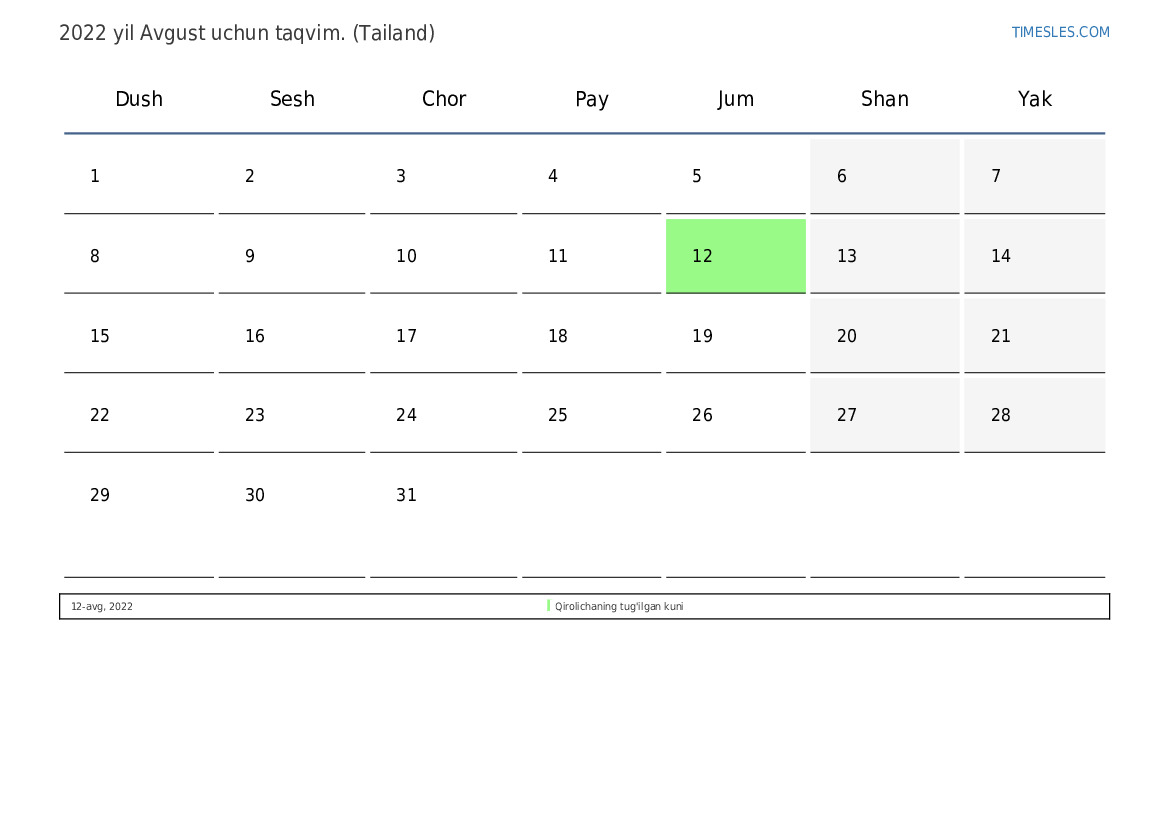 Tailand uchun 2022 yil Avgust uchun ta'til va dam olish kunlari taqvimi