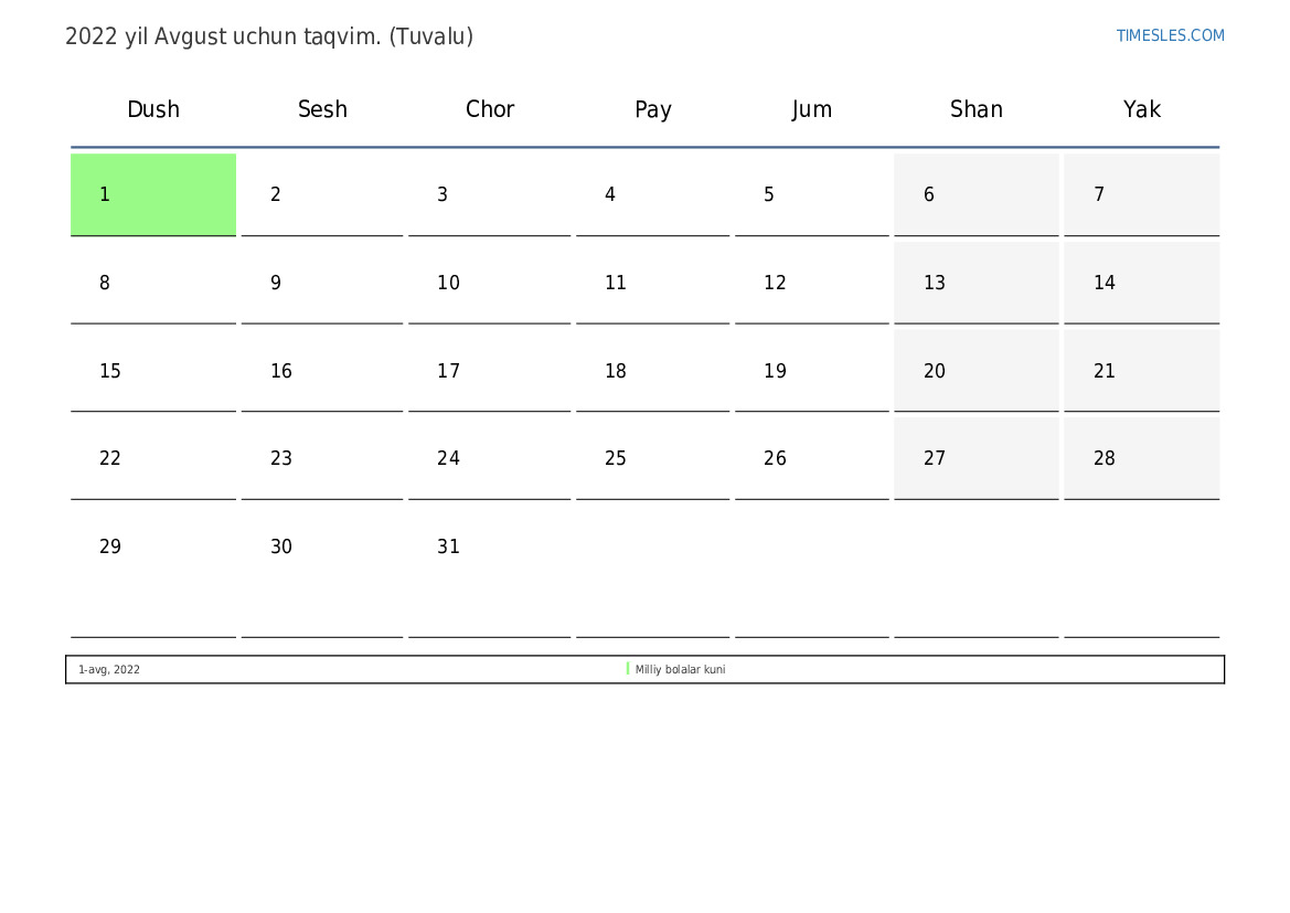 Tuvalu uchun 2022 yil Avgust uchun ta'til va dam olish kunlari taqvimi