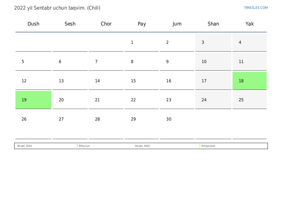 Chili uchun 2022 yil Sentabr uchun ta'til va dam olish kunlari taqvimi
