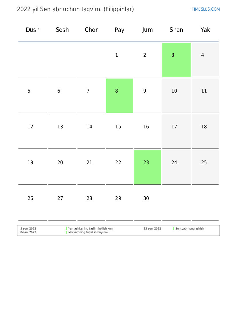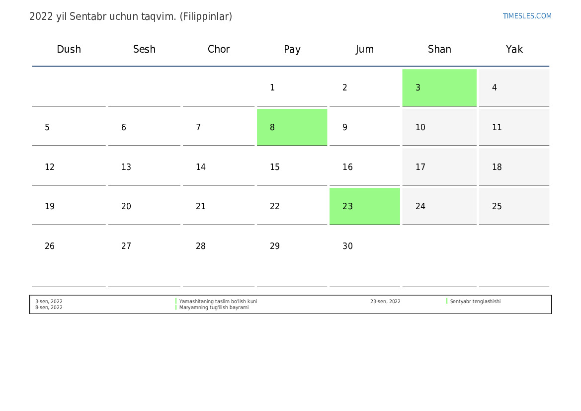 Filippin uchun 2022 yil Sentabr uchun ta'til va dam olish kunlari taqvimi