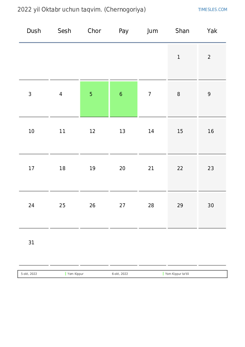 Chernogoriya uchun 2022 yil Oktabr kalendar