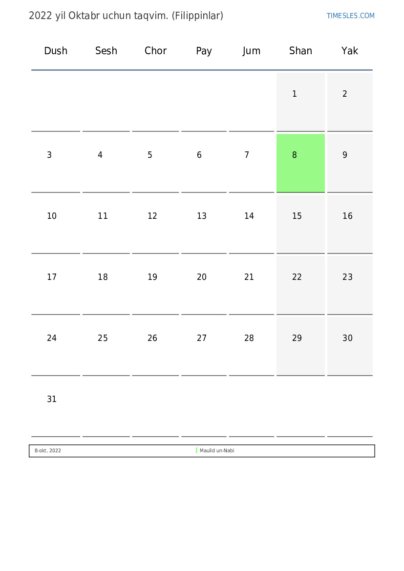 Filippin uchun 2022 yil Oktabr uchun ta'til va dam olish kunlari taqvimi