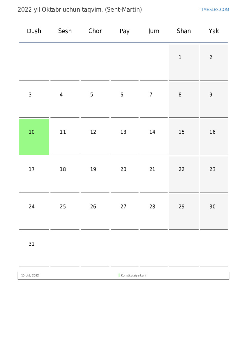 Sint Marten uchun 2022 yil Oktabr uchun ta'til va dam olish kunlari taqvimi