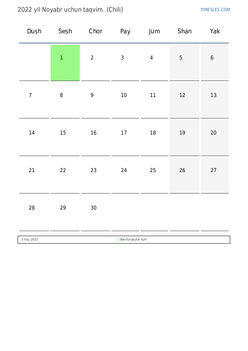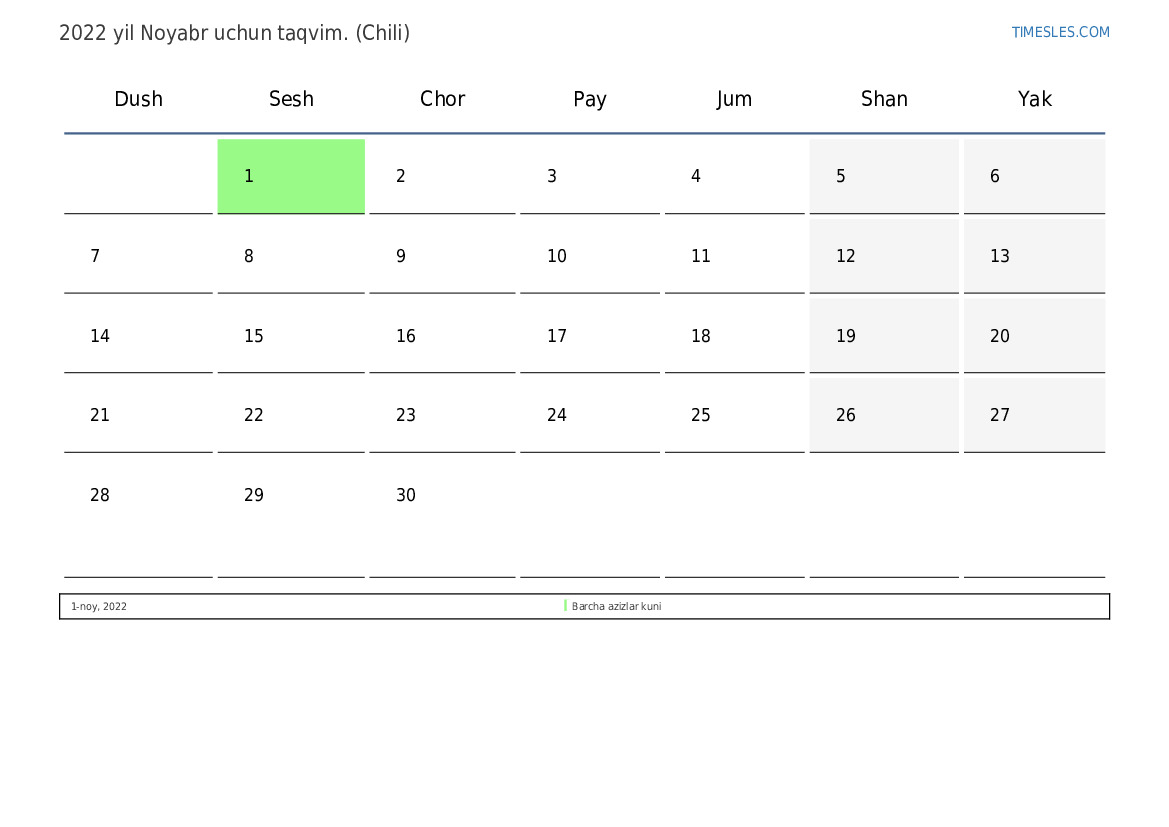 Chili uchun 2022 yil Noyabr uchun ta'til va dam olish kunlari taqvimi