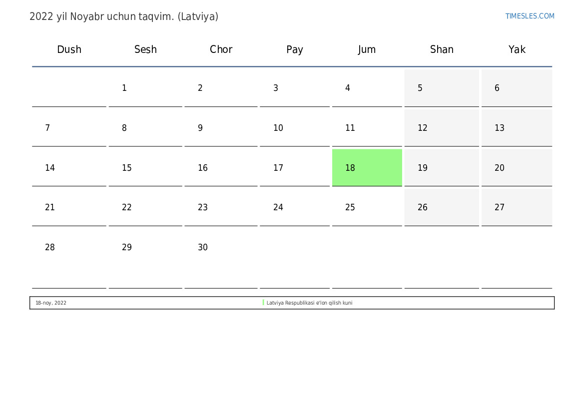 Latviya uchun 2022 yil Noyabr uchun ta'til va dam olish kunlari bilan PDF taqvimini yuklab oling va chop eting