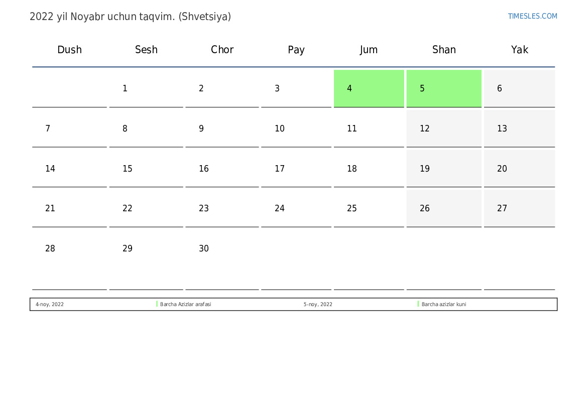 Shvetsiya uchun 2022 yil Noyabr uchun ta'til va dam olish kunlari taqvimi