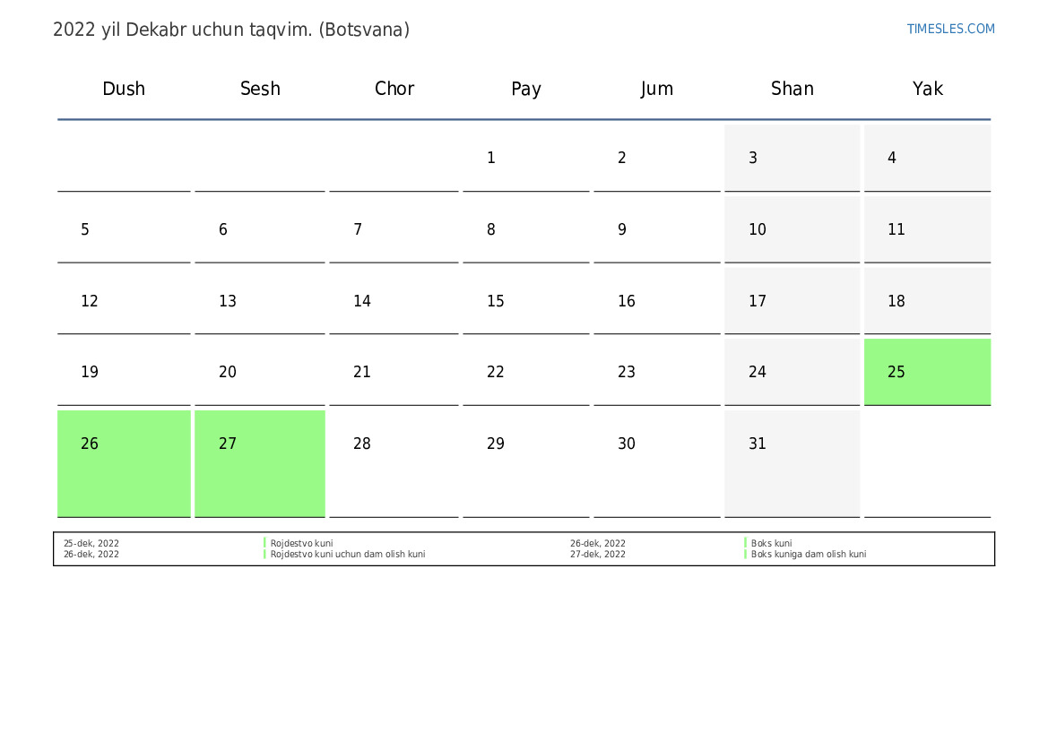 Botsvana uchun 2022 yil Dekabr uchun ta'til va dam olish kunlari taqvimi