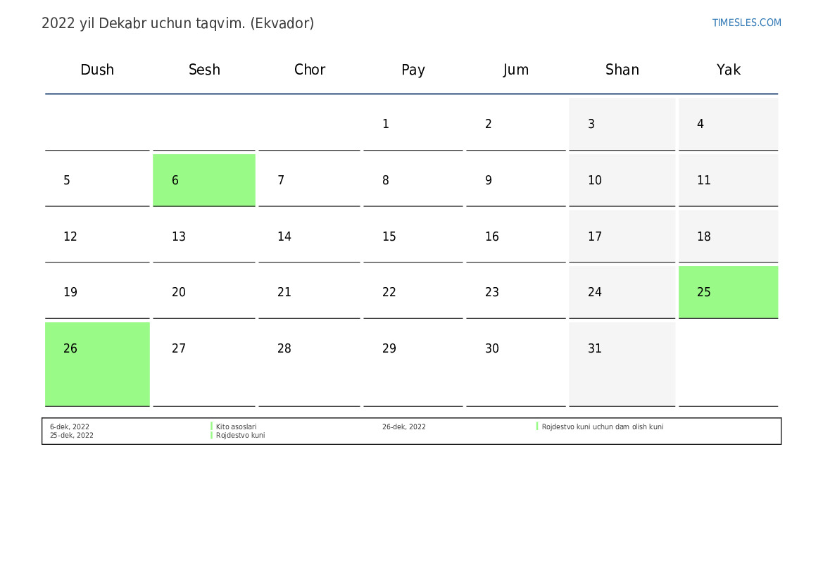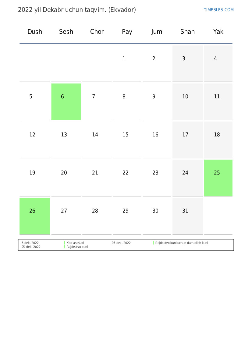 Ekvador uchun 2022 yil Dekabr uchun ta'til va dam olish kunlari taqvimi
