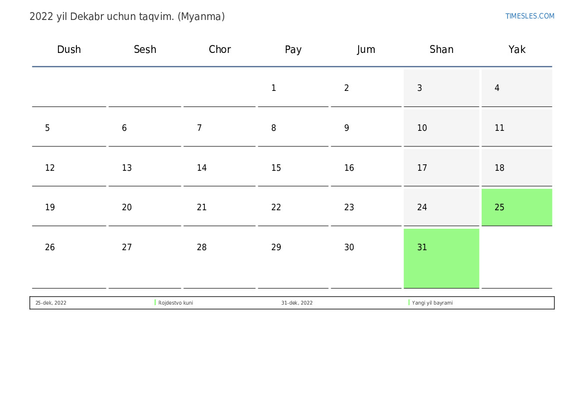 Myanma uchun 2022 yil Dekabr uchun ta'til va dam olish kunlari bilan PDF taqvimini yuklab oling va chop eting