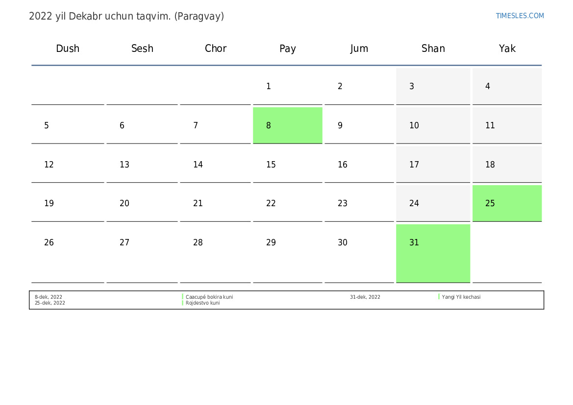 Paragvay uchun 2022 yil Dekabr uchun ta'til va dam olish kunlari taqvimi