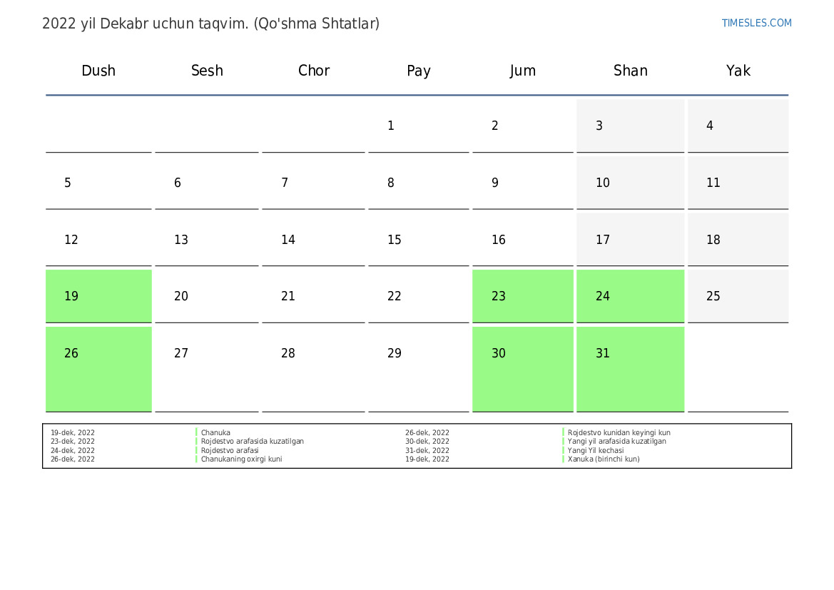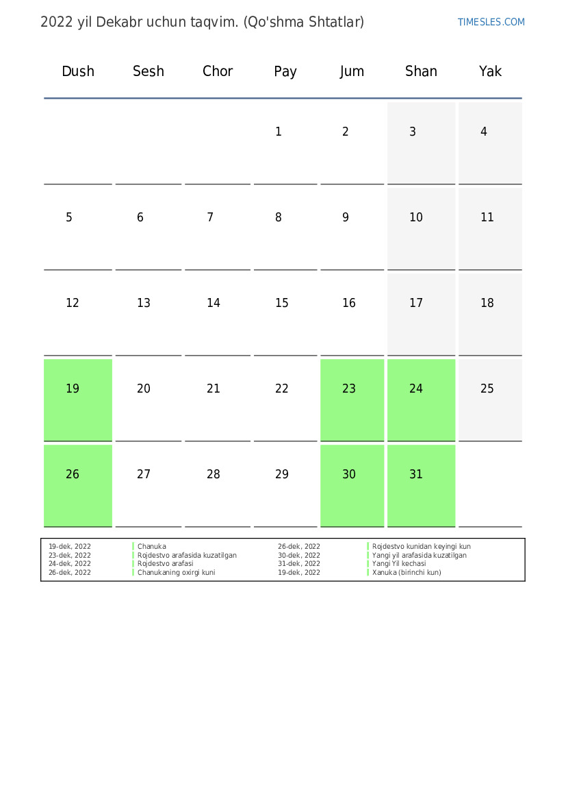 26-dek, 2022 Rojdestvo kuni uchun dam olish kuni