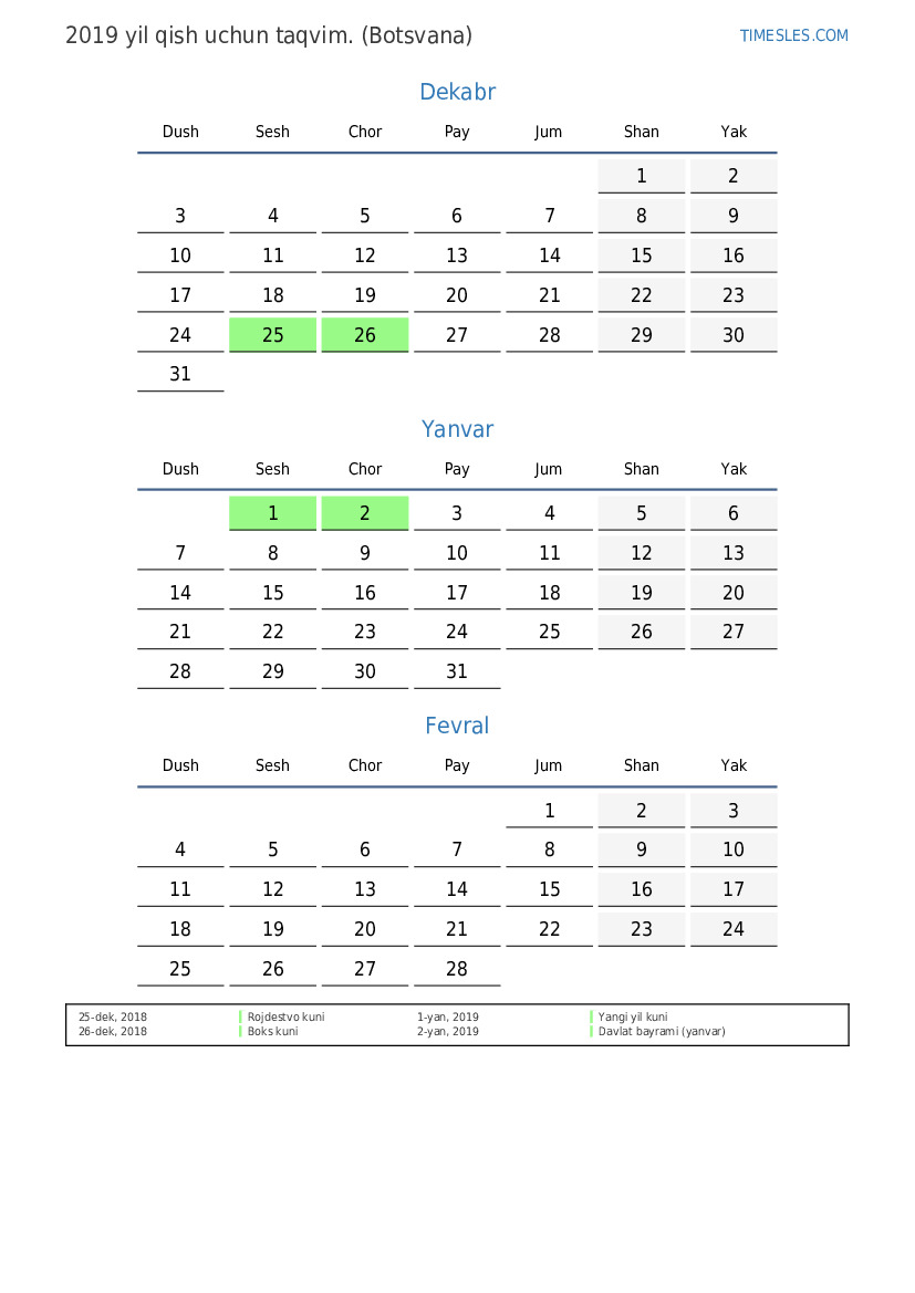 Botsvana uchun 2019 yil kuz uchun ta'til va dam olish kunlari taqvimi