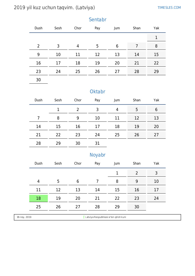 Latviya uchun 2019 yilgi kuz uchun taqvim