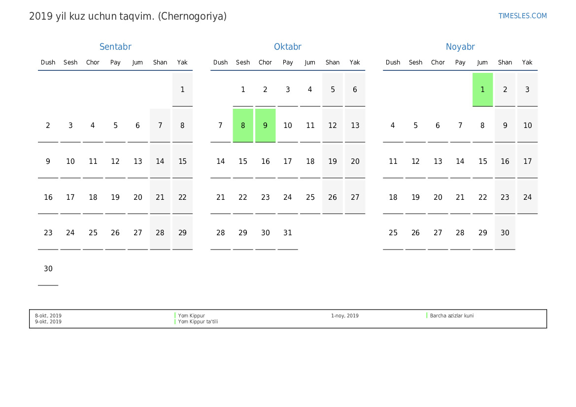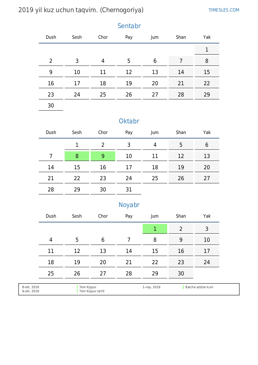 Chernogoriya uchun 2019 yilgi kuz uchun taqvim