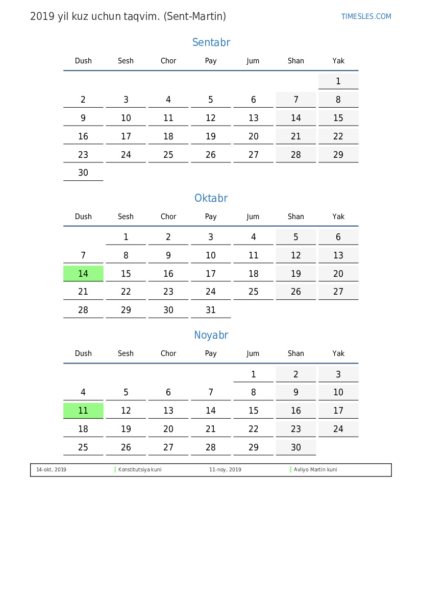 Sint Marten uchun 2019 yil kuz uchun ta'til va dam olish kunlari taqvimi