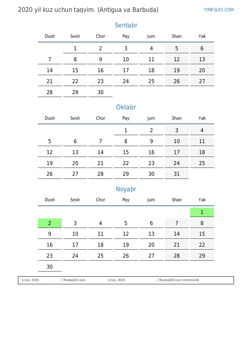 Antigua va Barbuda uchun 2020 yilgi kuz uchun taqvim
