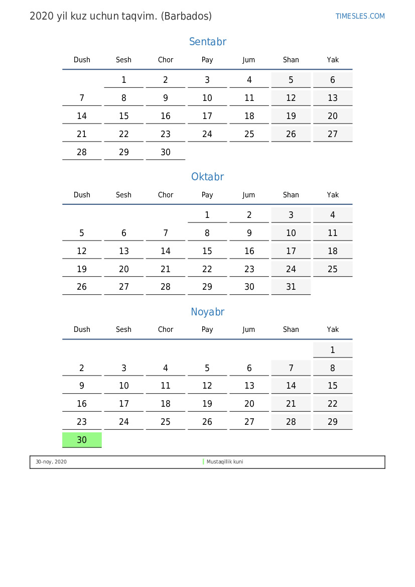 Barbados uchun 2020 yil kuz uchun ta'til va dam olish kunlari taqvimi