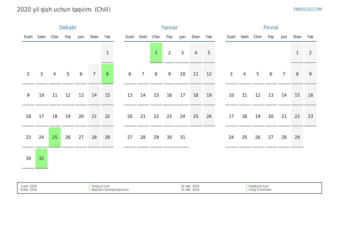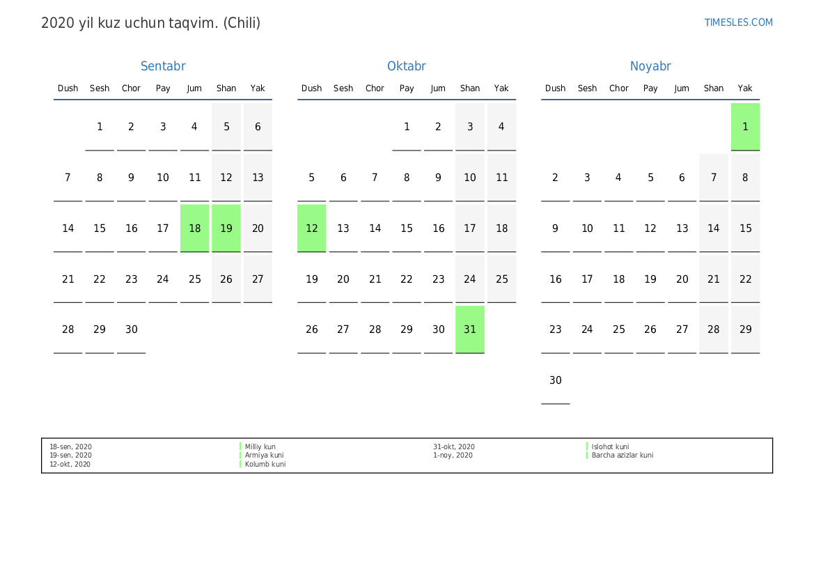 Chili uchun 2020 yil kuz uchun ta'til va dam olish kunlari taqvimi
