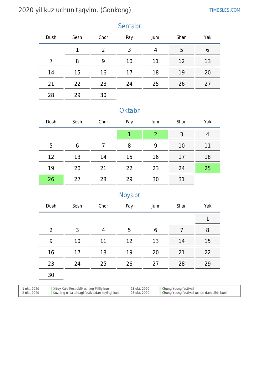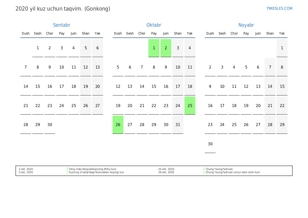 26-okt, 2020 Chung Yeung festivali uchun dam olish kuni