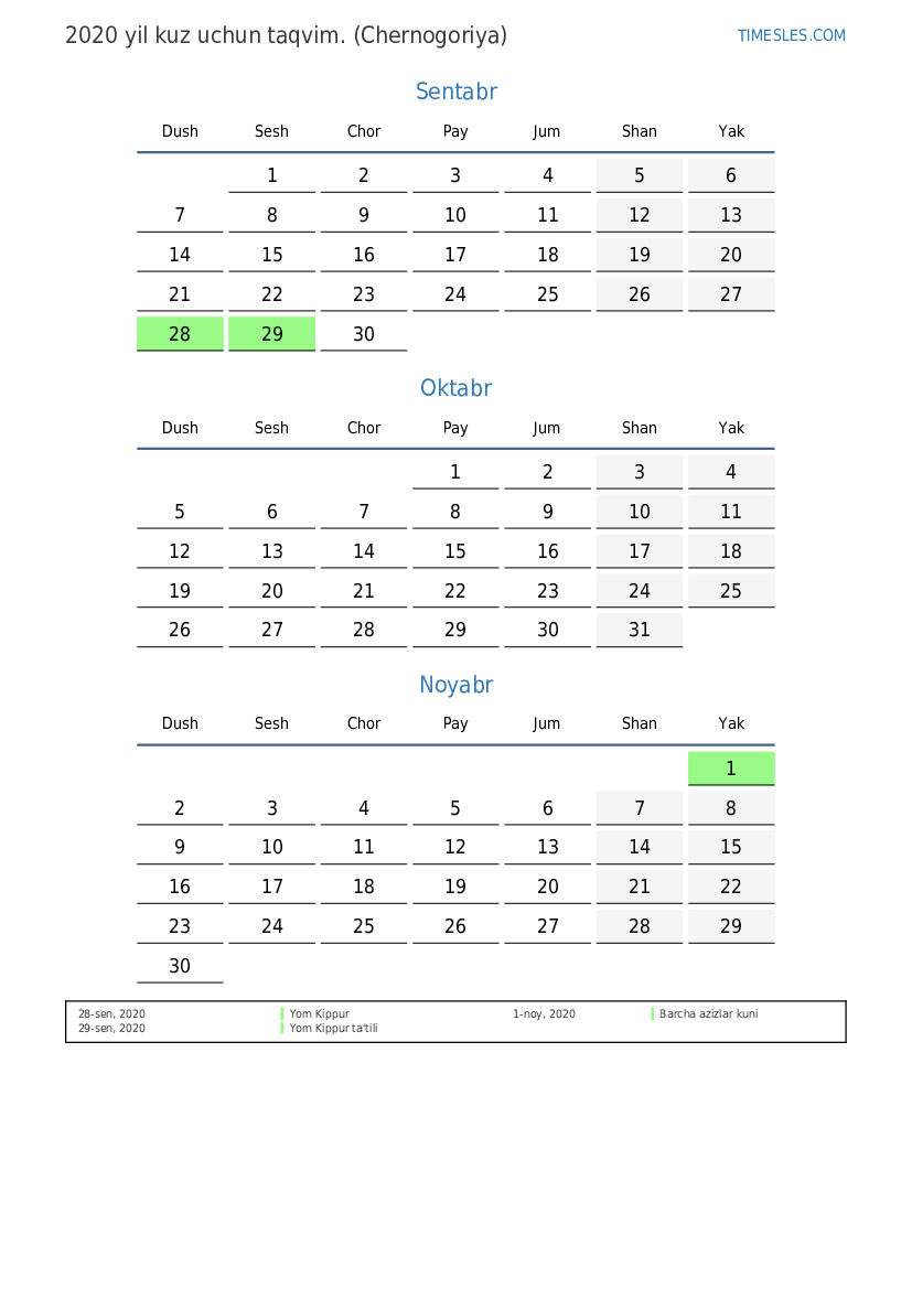 Chernogoriya uchun 2020 yilgi kuz uchun taqvim