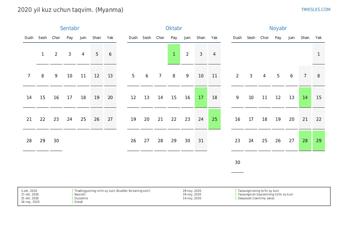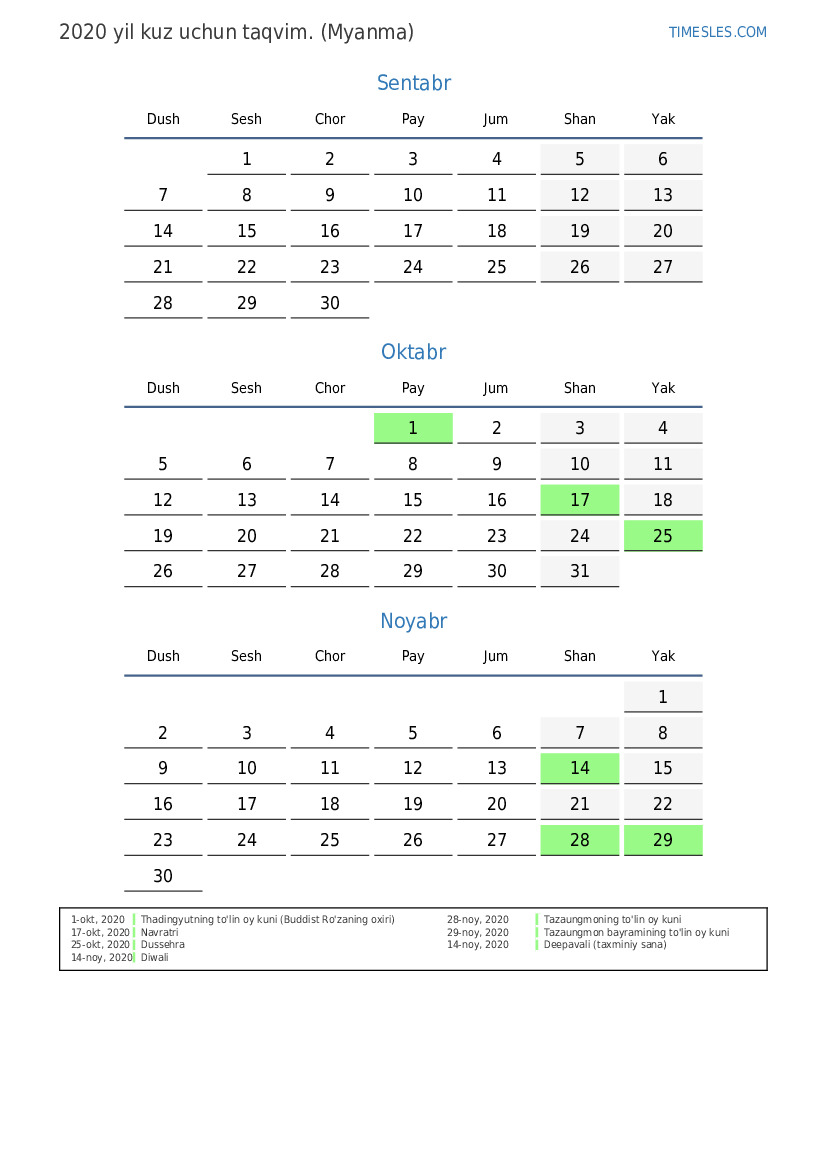 Myanma uchun 2020 yil kuz uchun ta'til va dam olish kunlari bilan PDF taqvimini yuklab oling va chop eting