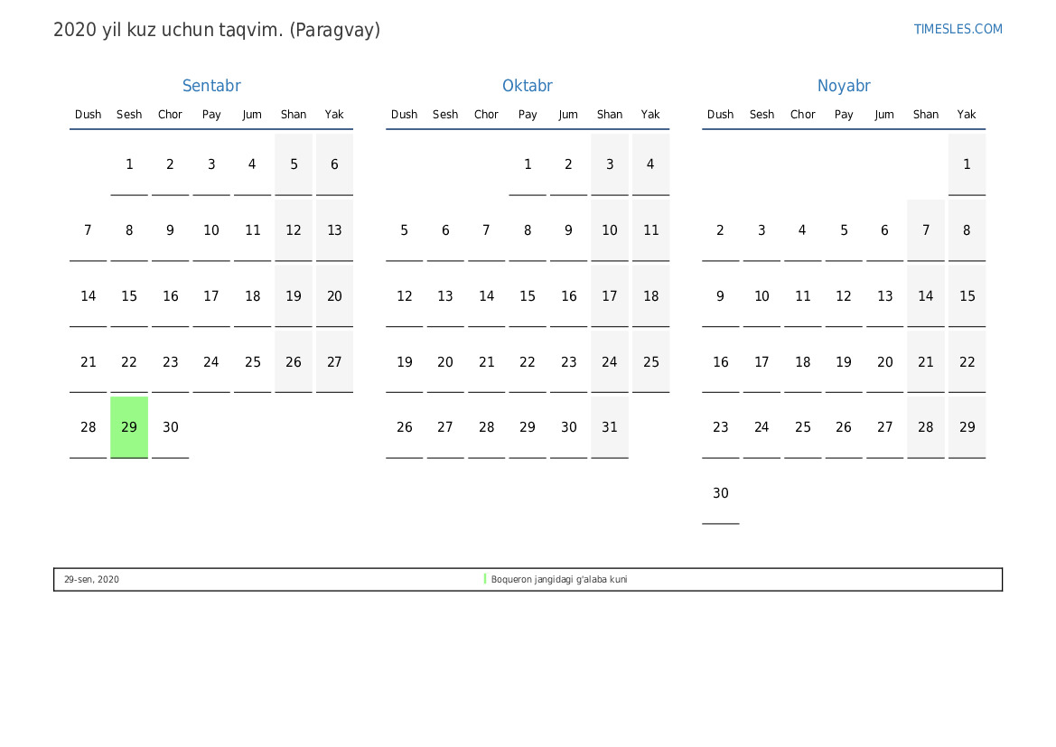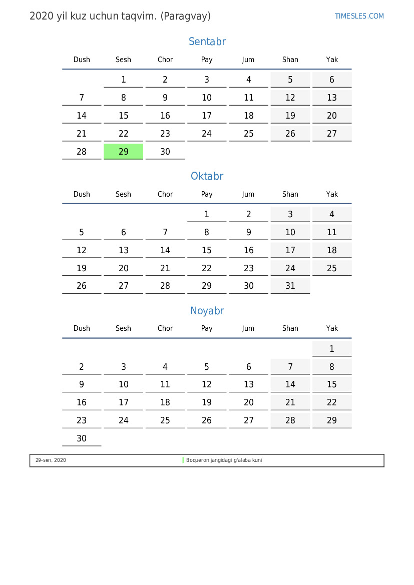 Paragvay uchun 2020 yilgi kuz uchun taqvim