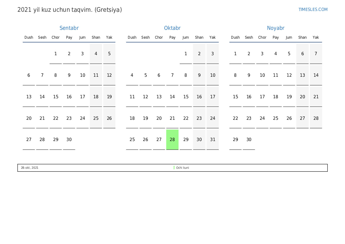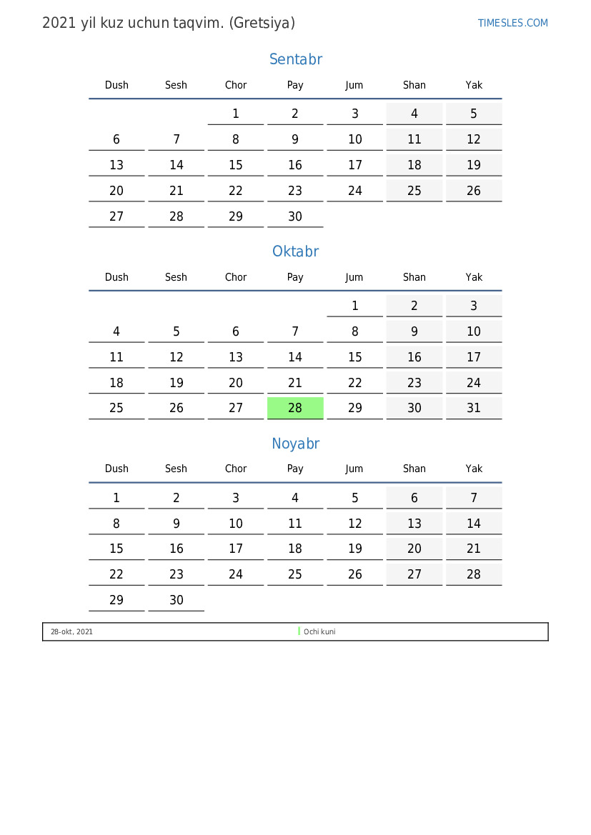 Gretsiya uchun 2021 yilgi kuz uchun taqvim