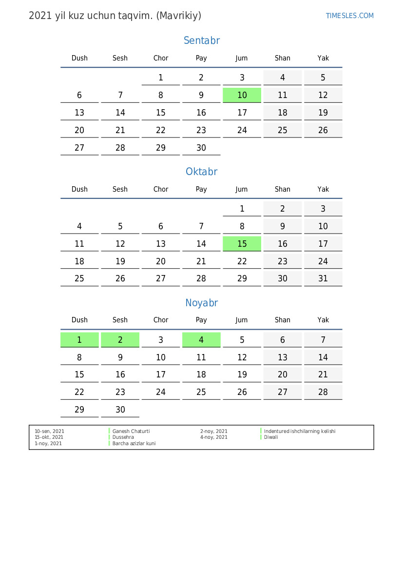 Mavrikiy uchun 2021 yil kuz uchun ta'til va dam olish kunlari taqvimi