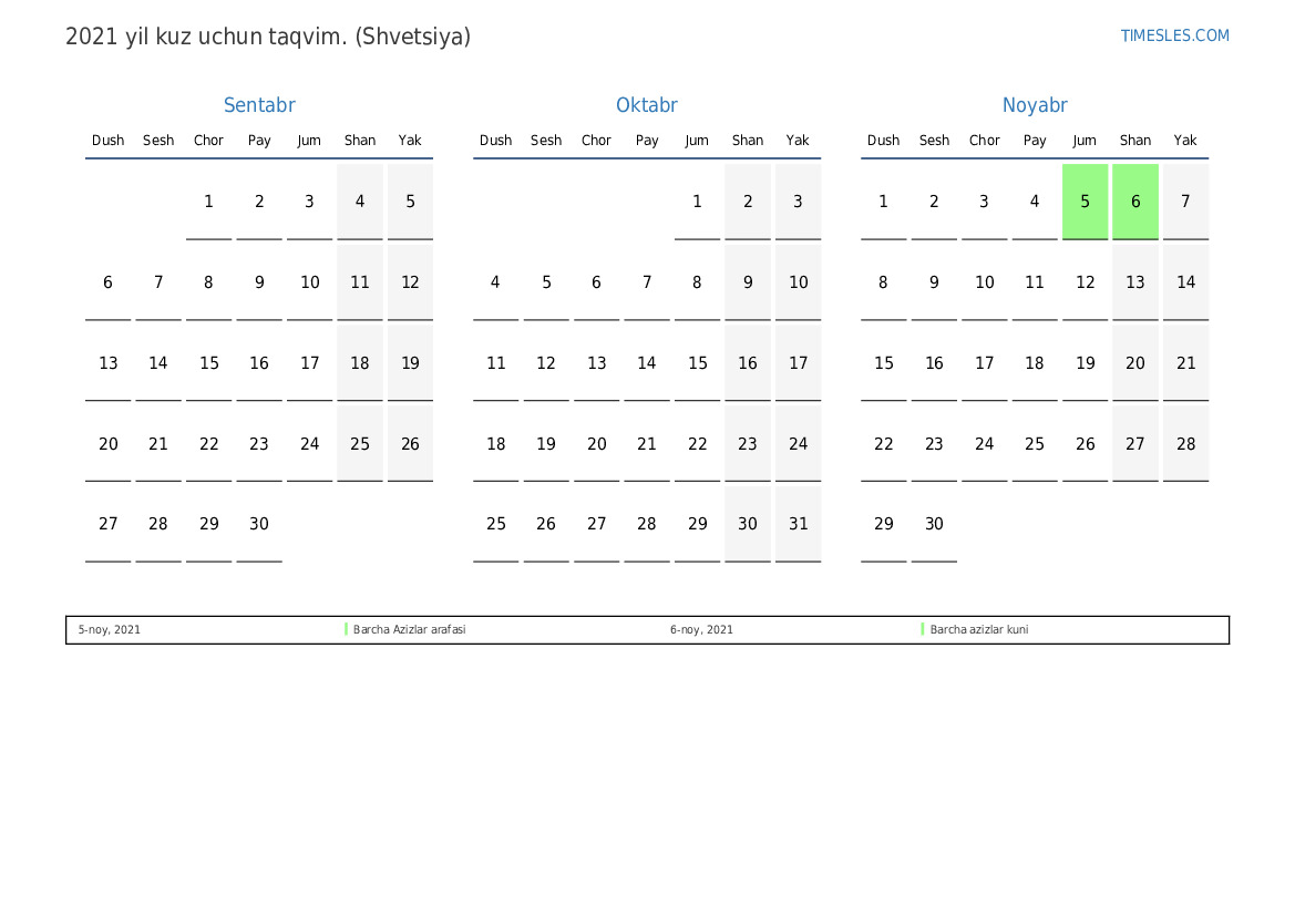 Shvetsiya uchun 2021 yilgi kuz uchun taqvim