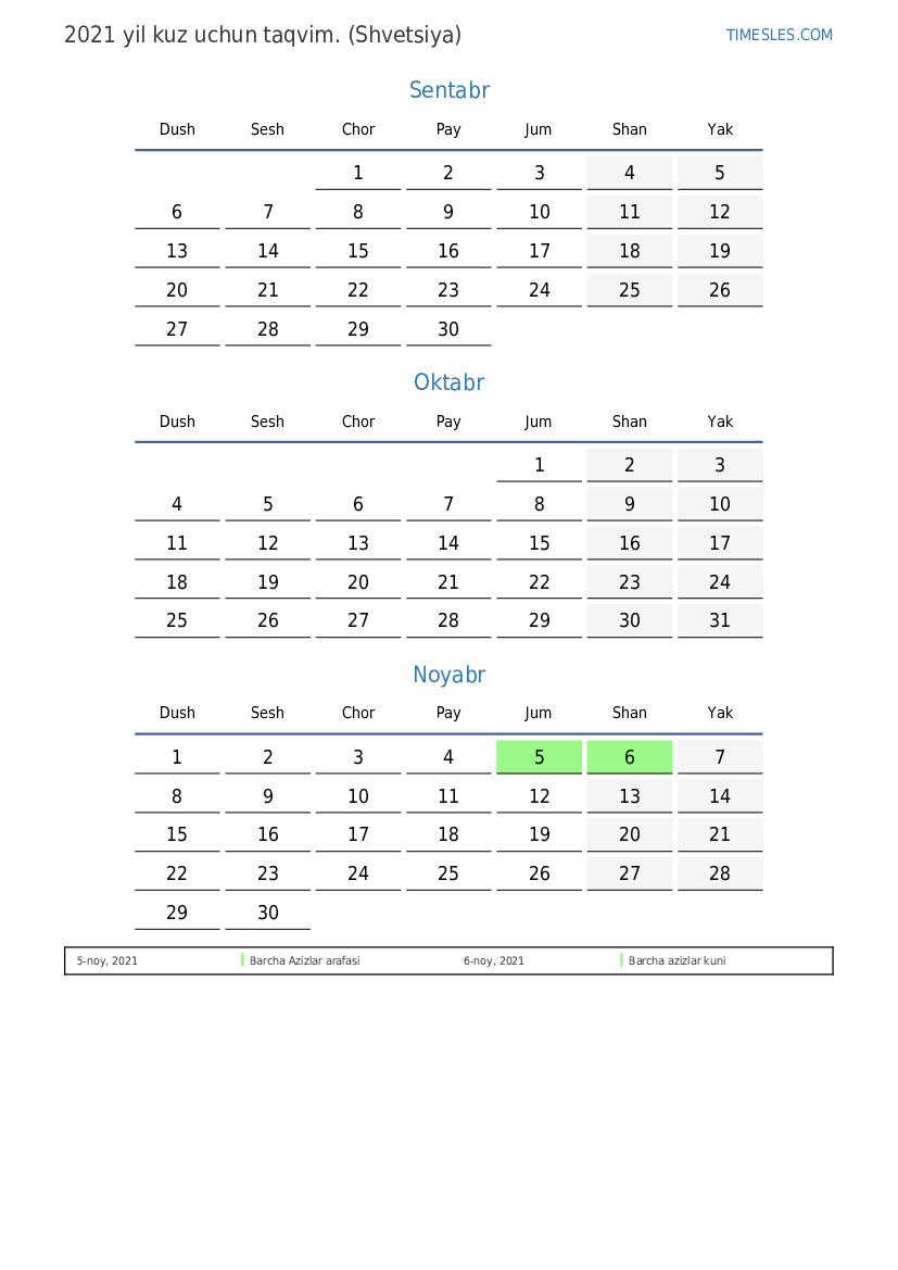 Shvetsiya uchun 2021 yil kuz uchun ta'til va dam olish kunlari bilan PDF taqvimini yuklab oling va chop eting